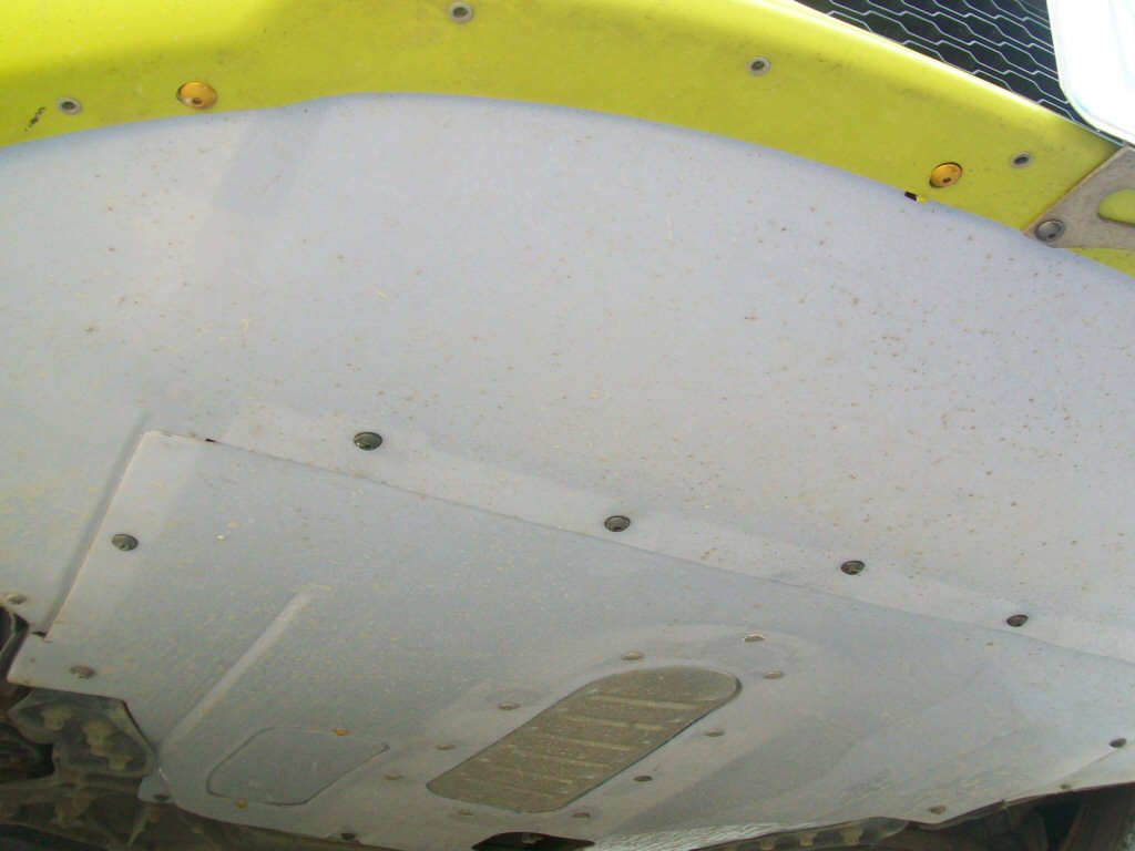 The stock clouseout panel is made from very thin polyethylene, while the belly pan is a fiber material with an aluminum heat shield. Our new version